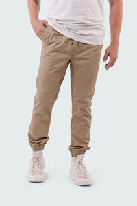 Soft organic cotton twill cargo joggers with adjustable drawcord waist, articulated knees, and elastic cuffs for everyday mobility.