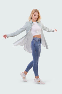 Mid-rise light blue skinny jeans with stretch comfort, classic 5-pocket styling, and durable construction, designed for both style and everyday functionality.