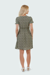 Lightweight rayon crepe dress with ditsy floral print, puff sleeves, and a softly fitted waist, blending comfort with feminine charm for everyday wear.