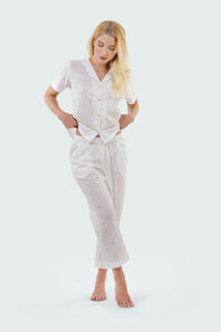 Crisp organic cotton poplin pajama set with classic piping, notched collar top, and soft elastic waist for airy comfort.