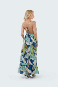 A lightweight, flowy maxi dress featuring a bold abstract print, adjustable tie-back straps, and a tiered skirt for effortless summer elegance.