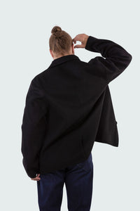 Warm and durable black wool-blend jacket with a relaxed fit, classic button closure, and sustainable recycled polyester content, ideal for versatile outerwear layering.